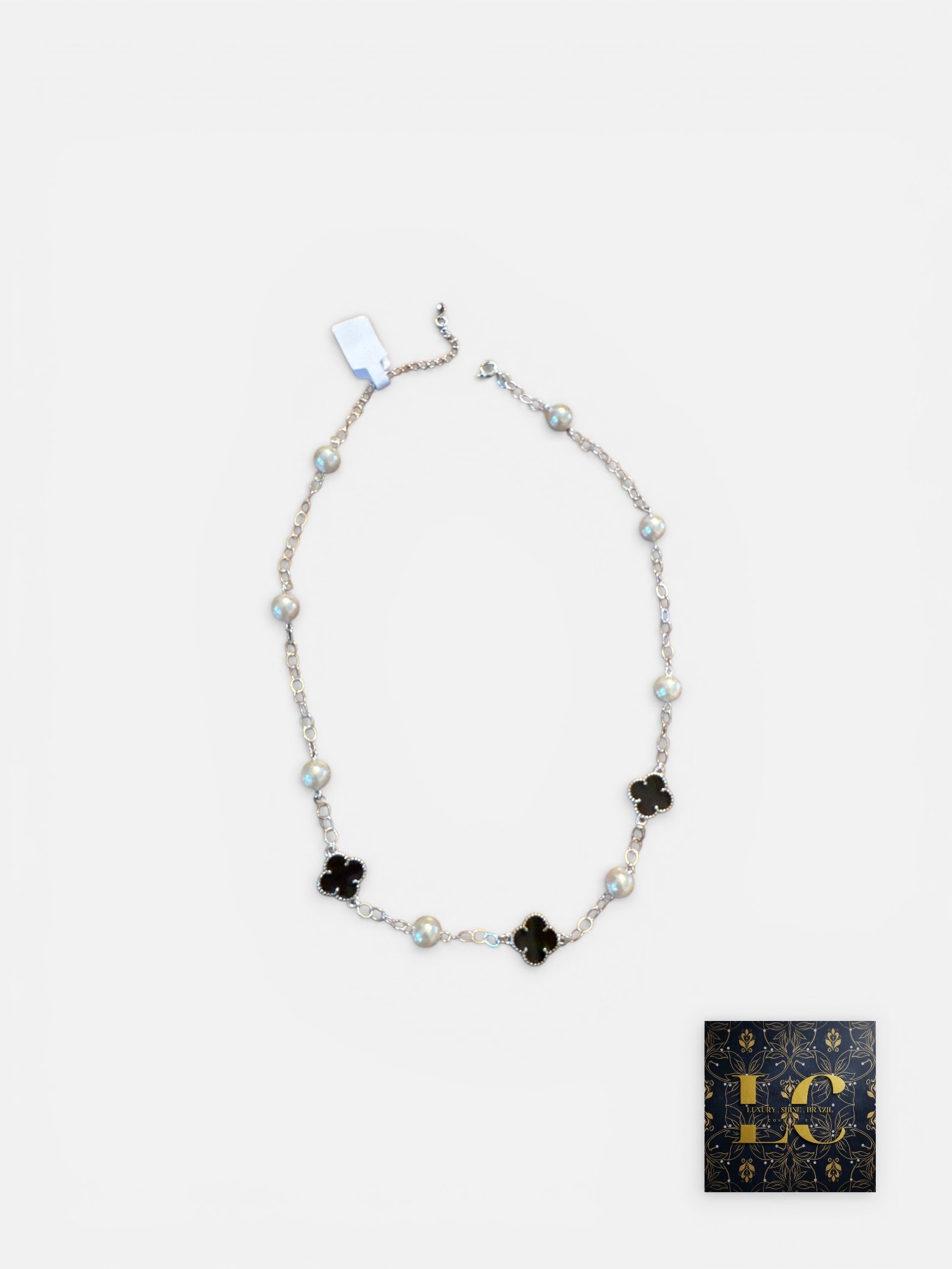 Inspired by refined European elegance, this delicate necklace combines luminous pearls with three black clover accents, creating a harmonious balance between softness and sophistication. The contrast of textures evokes timeless beauty and understated luxury.